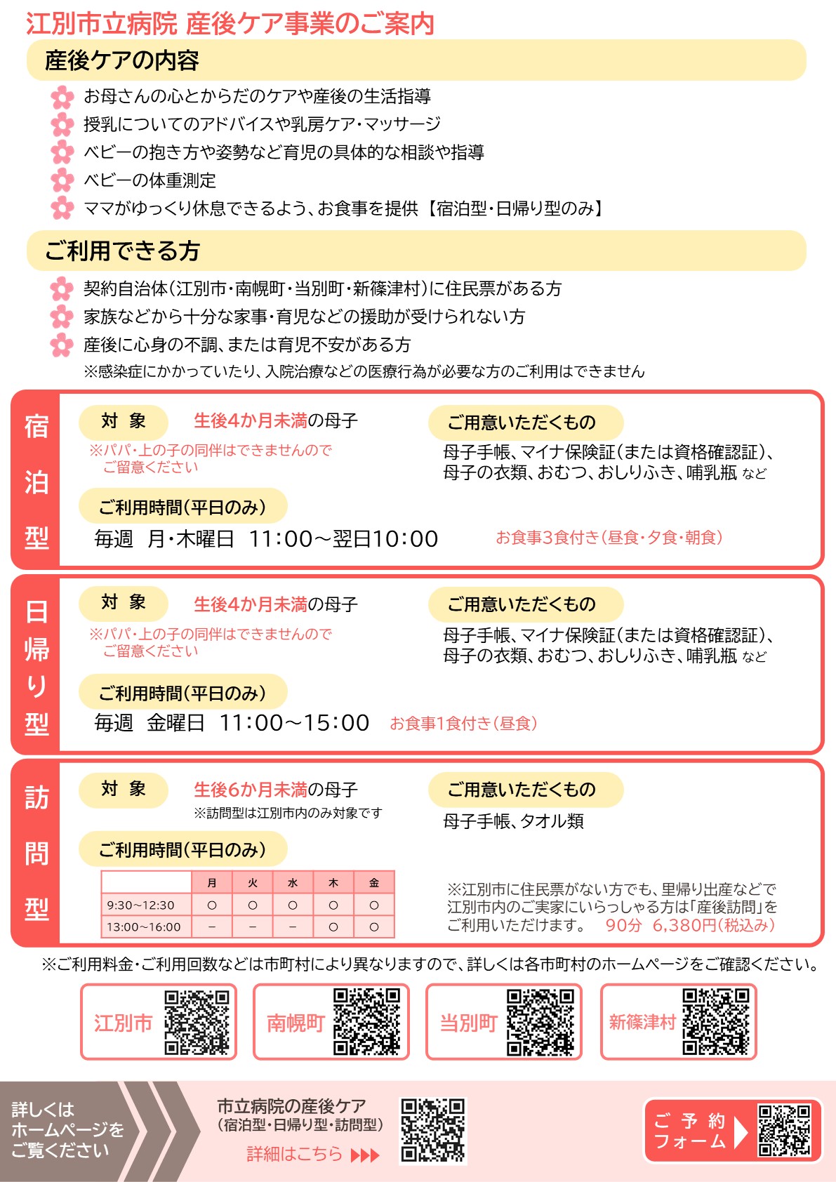 江別市に住民票がない方は訪問型産後ケア事業の対象となりませんが、里帰り出産などで江別市内のご実家にいらっしゃる方を対象に当院では「産後訪問」を実施しています。産後訪問の料金は90分・6,380円(税込)となります。